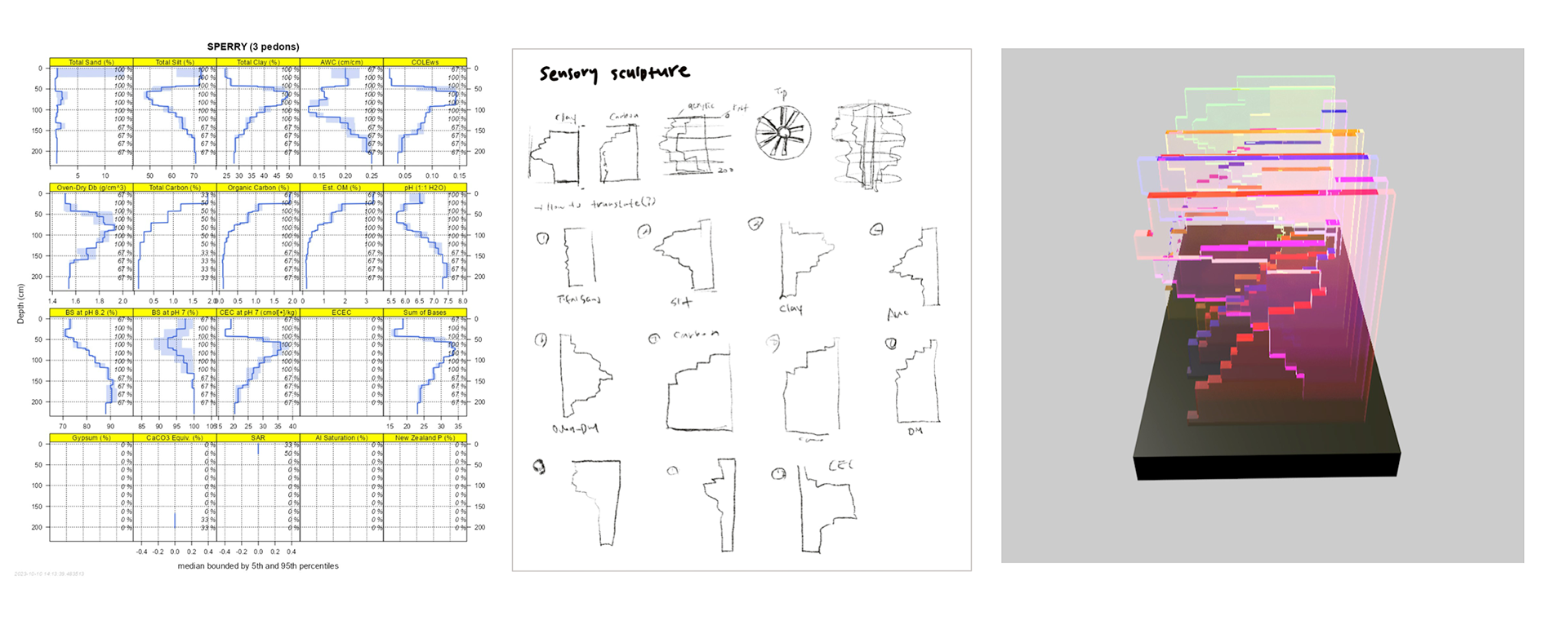 Understanding 2D data like this soil profile can be challenging, especially for the public and those unfamiliar with soil science. However, learning about soil properties is essential for conserving topsoil, the vital layer that supports all plant growth. This graph illustrates various soil characteristics, such as sand, silt, and clay content, as well as carbon and pH levels, across different depths.